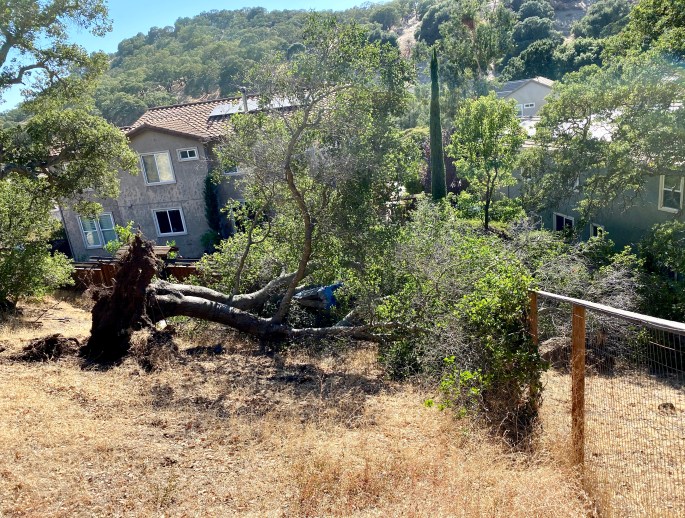 A 30-foot oak treee can come crashing down at any time in your garden of roses, crushing many of them.